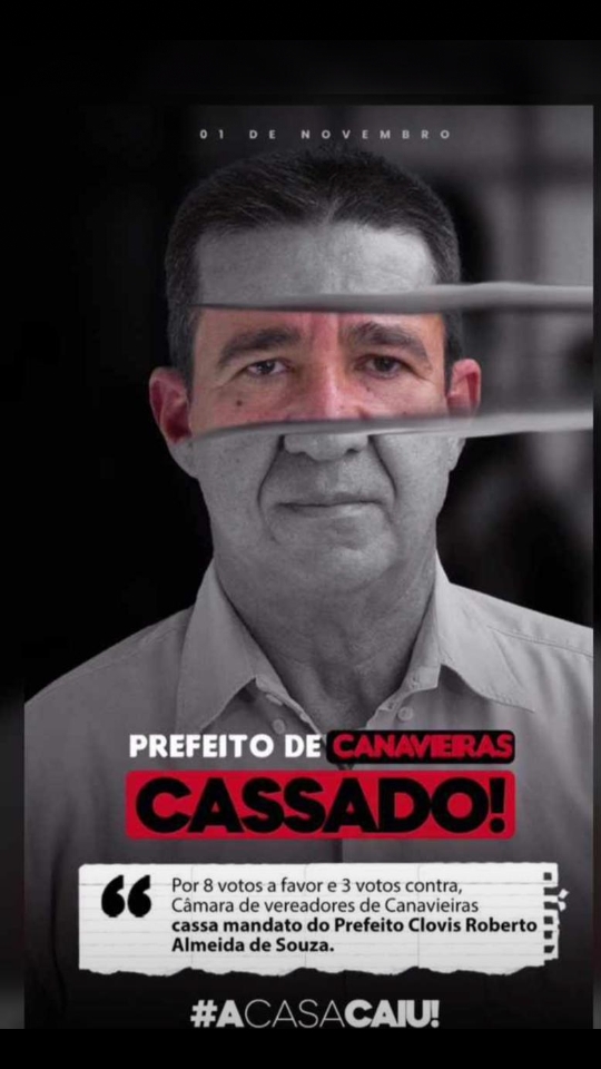 Na 3° sessão extraordinária realizada nesta quarta-feira (01), no Plenário Vereador Dr. Otoniel Men Cassemiro Neto da Câmara Municipal de Veradores de Canavieiras no sul da Bahia, a maioria absoluta edis votaram por aprovar o parecer que determina a perda do mandato do prefeito local. No mês de agosto do corrente ano foi instalada uma Comissão Parlamentar Processante (CPP) na Câmara de vereadores para investigar o prefeito por possíveis práticas de irregularidades administrativas. O prefeito Dr. Paulo Carvalho deve assumir o comando do poder executivo no município de Canavieiras. Conforme a Lei Orgânica do Município em seu Artigo 86, para que o Prefeito seja destituído do cargo processo de cassação deve ser aprovado por meio do voto de dois terços da Câmara Municipal. Atualmente Canavieiras possui onze Vereadores, o que faz com que seja necessário um numero mínimo de oito votos favoráveis para cassar o mandato de Dr. Almeida.